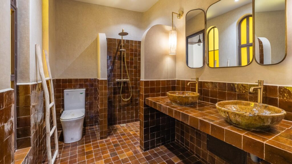 Toilettes séparées pour une intimité maximale au sein de chambre terracotta